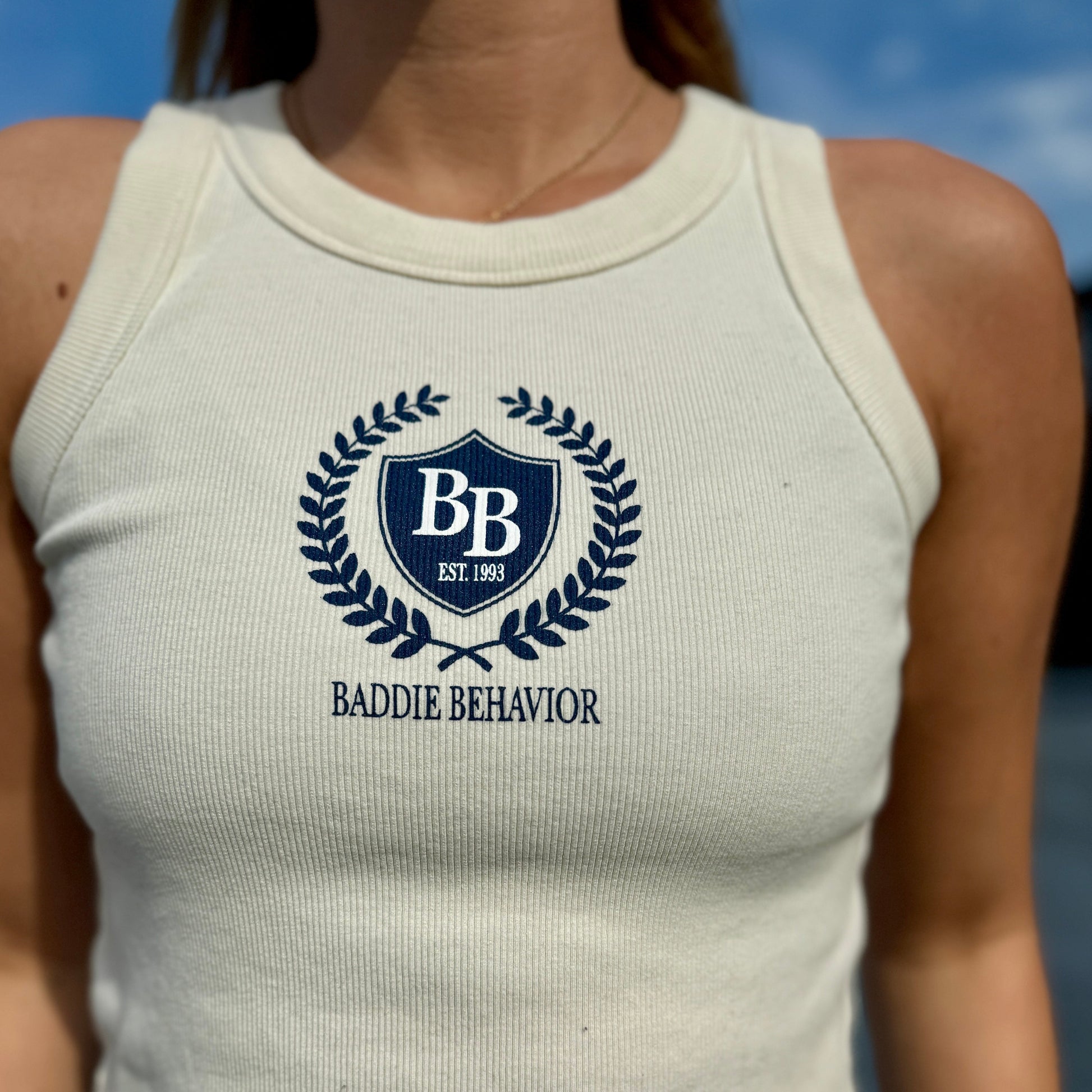 The Baddie Classic, no detail is left behind. Made with heavyweight organic cotton, a double needle hem and cut to have a sophisticated and flattering cropped fit. The BB crest ribbed tank is meant to be worn over and over again for baddie generations to come.