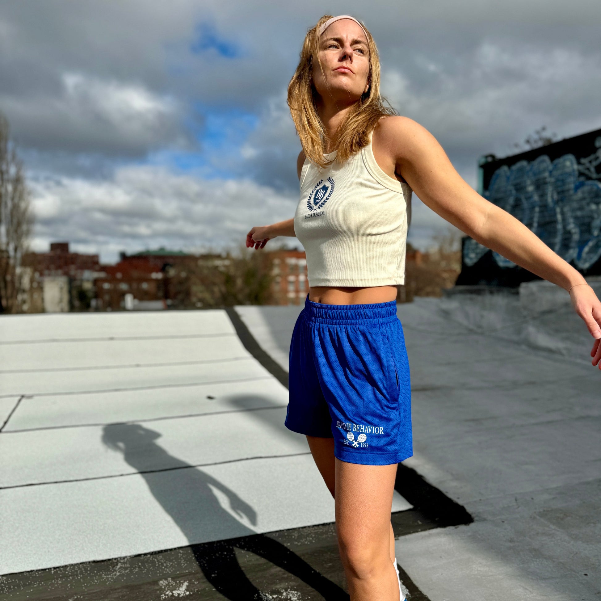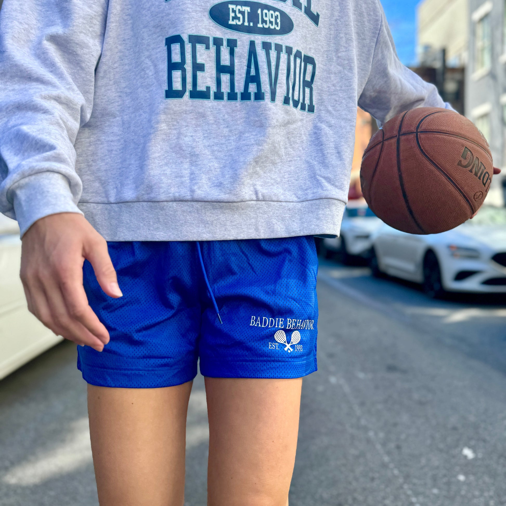 In a vibrant Princess Diana (Royal) Blue, you'll be a baddie on and off the court. These are made to move with you. A two layered breathable mesh with three custom zippered pockets at the side seams and on the back, an elastic encased waistband with interior drawstring for desired sizing. Featuring the classic Baddie Behavior racquet logo.