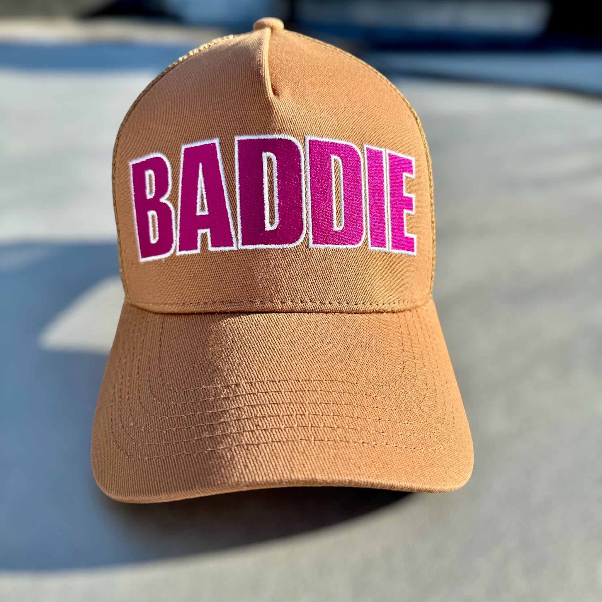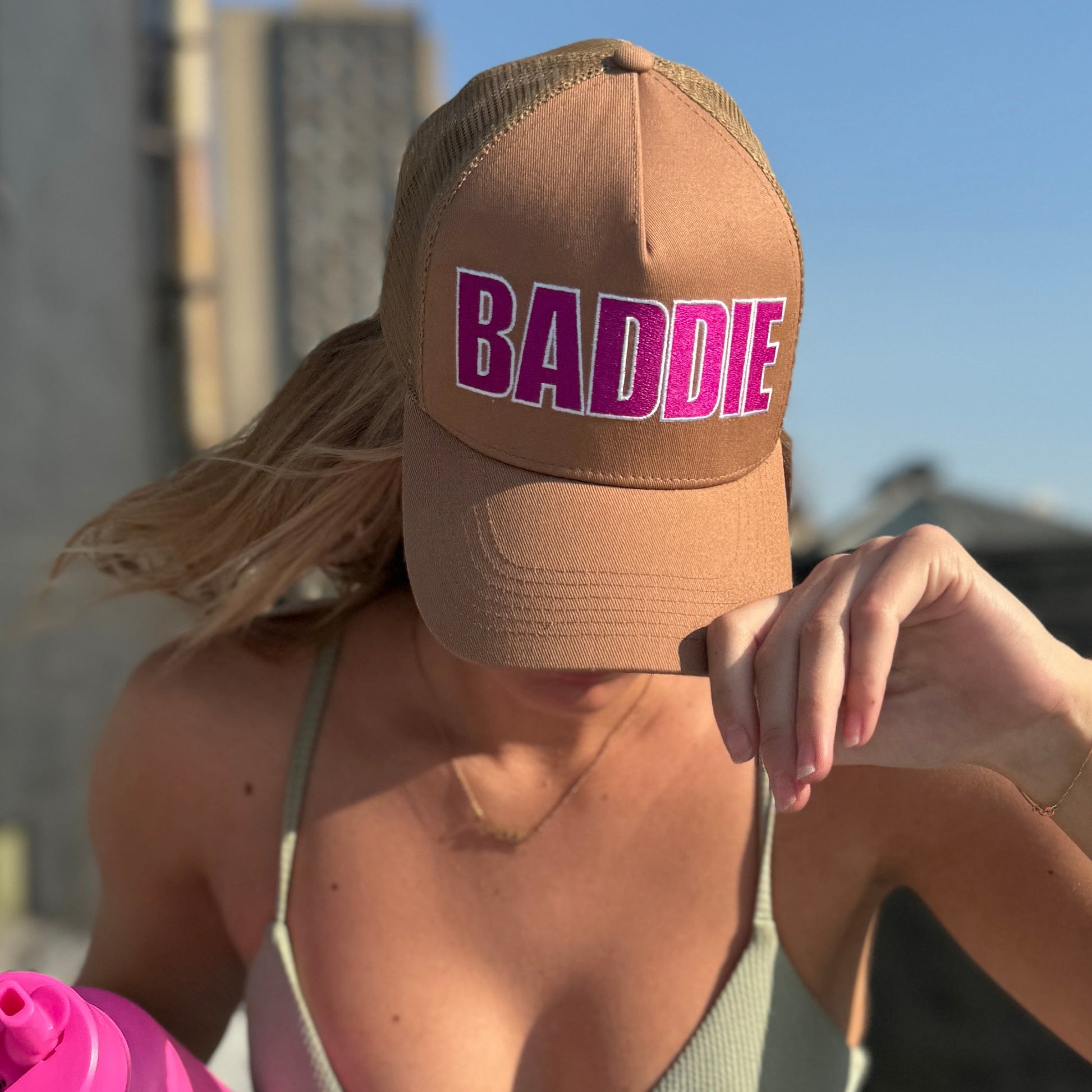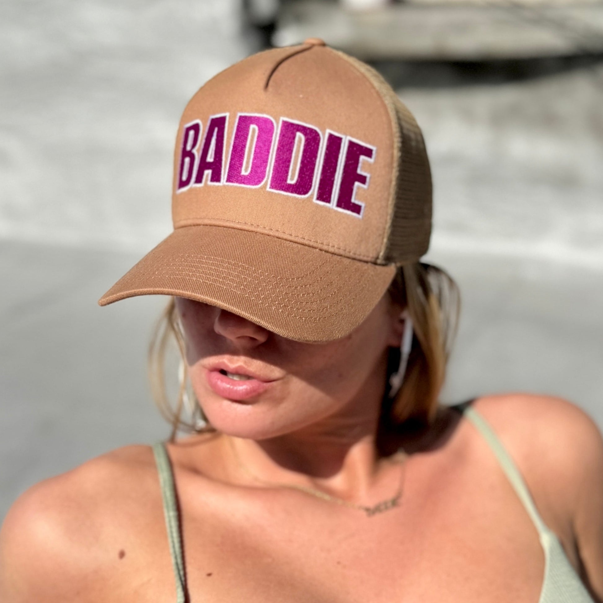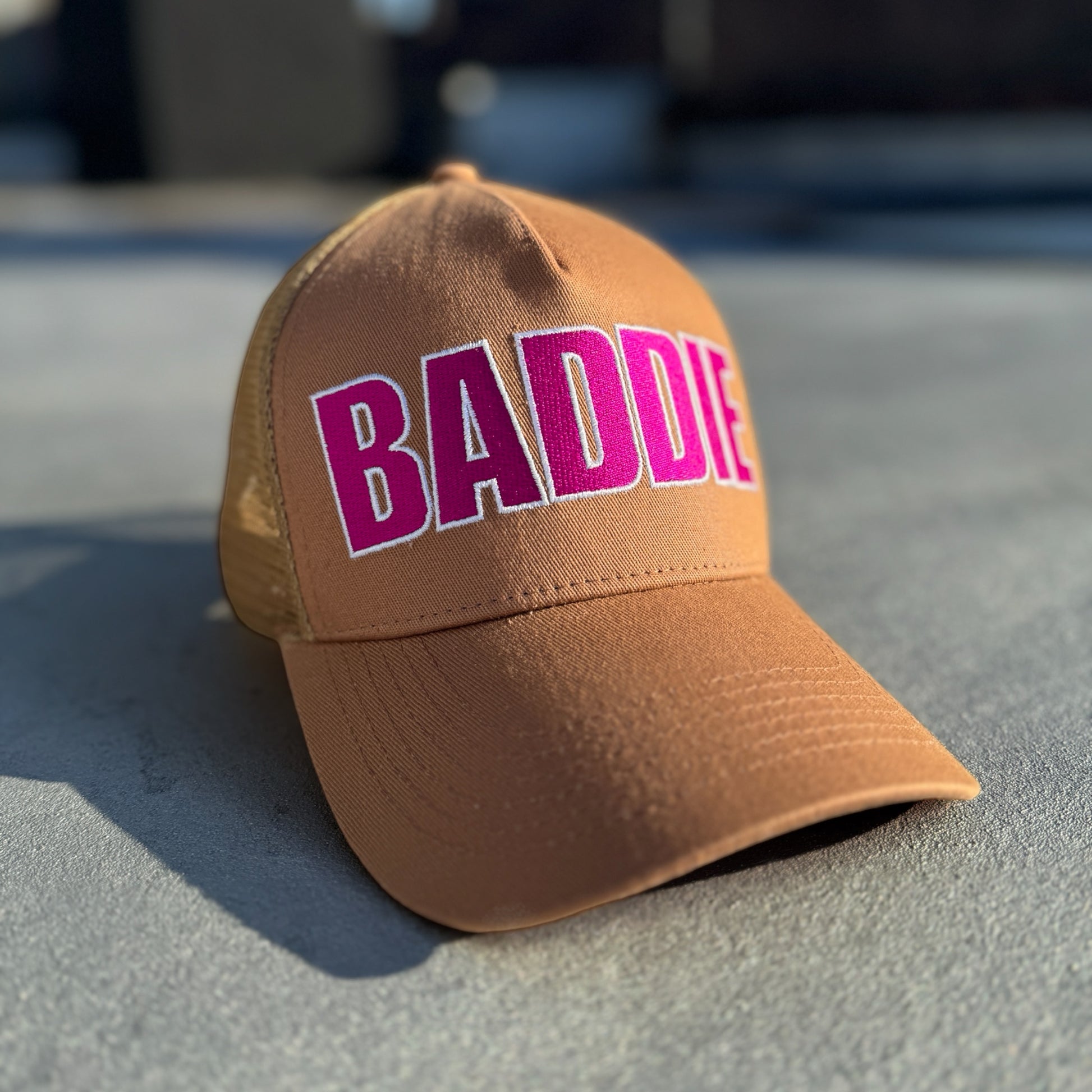 The ultimate Baddie accessory, there's nothing subtle about this hat. Made to be seen, BADDIE stitched in a vibrant hot pink Paris Hilton would be proud of with a white stitching outline.