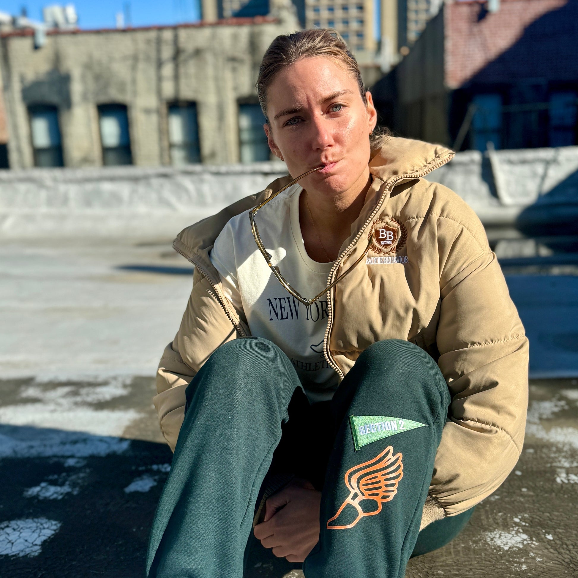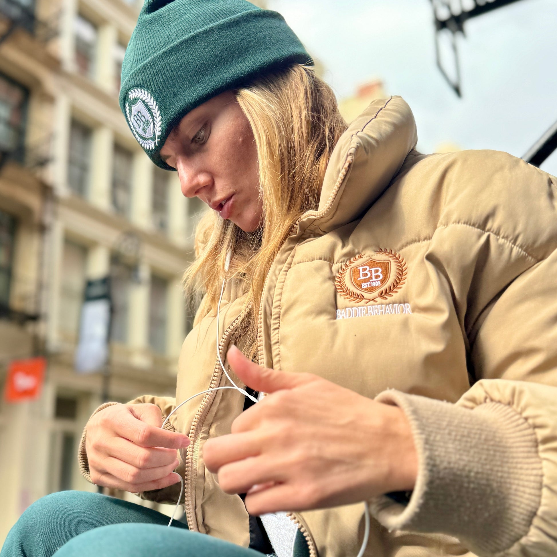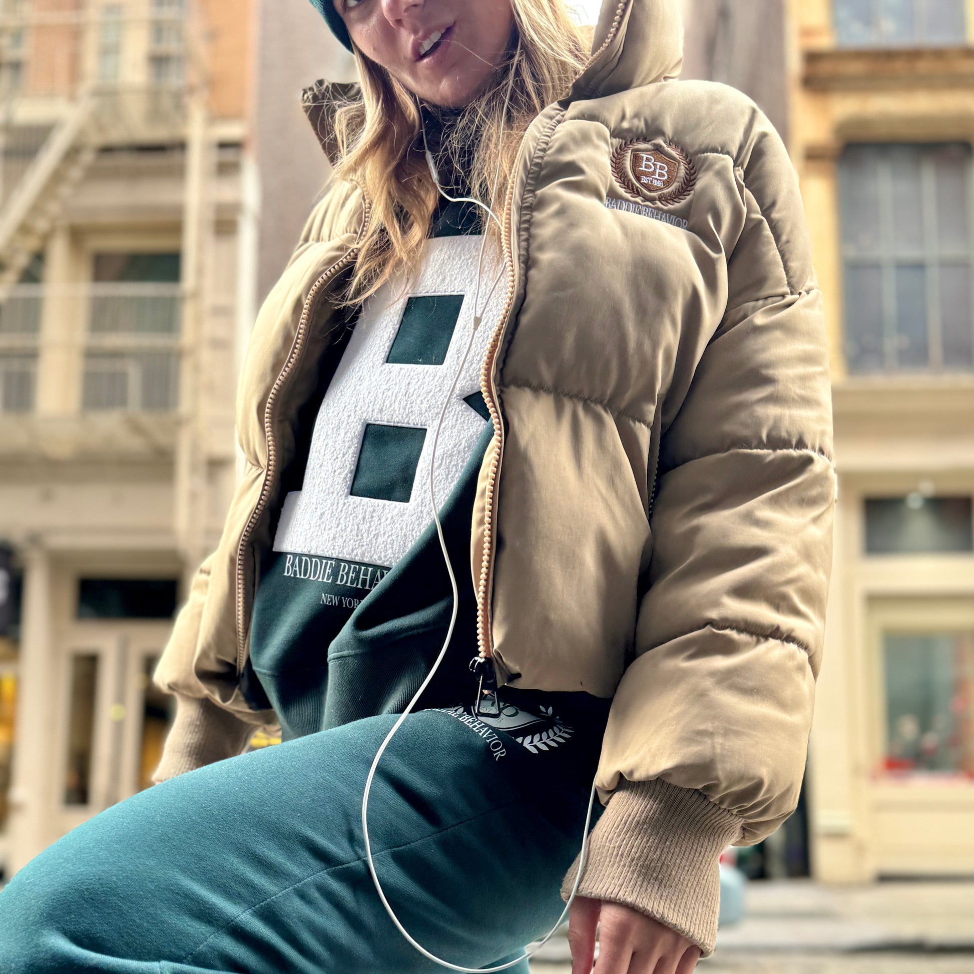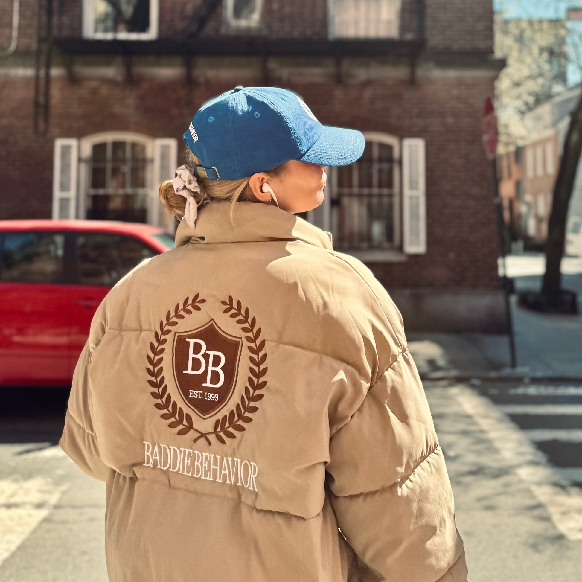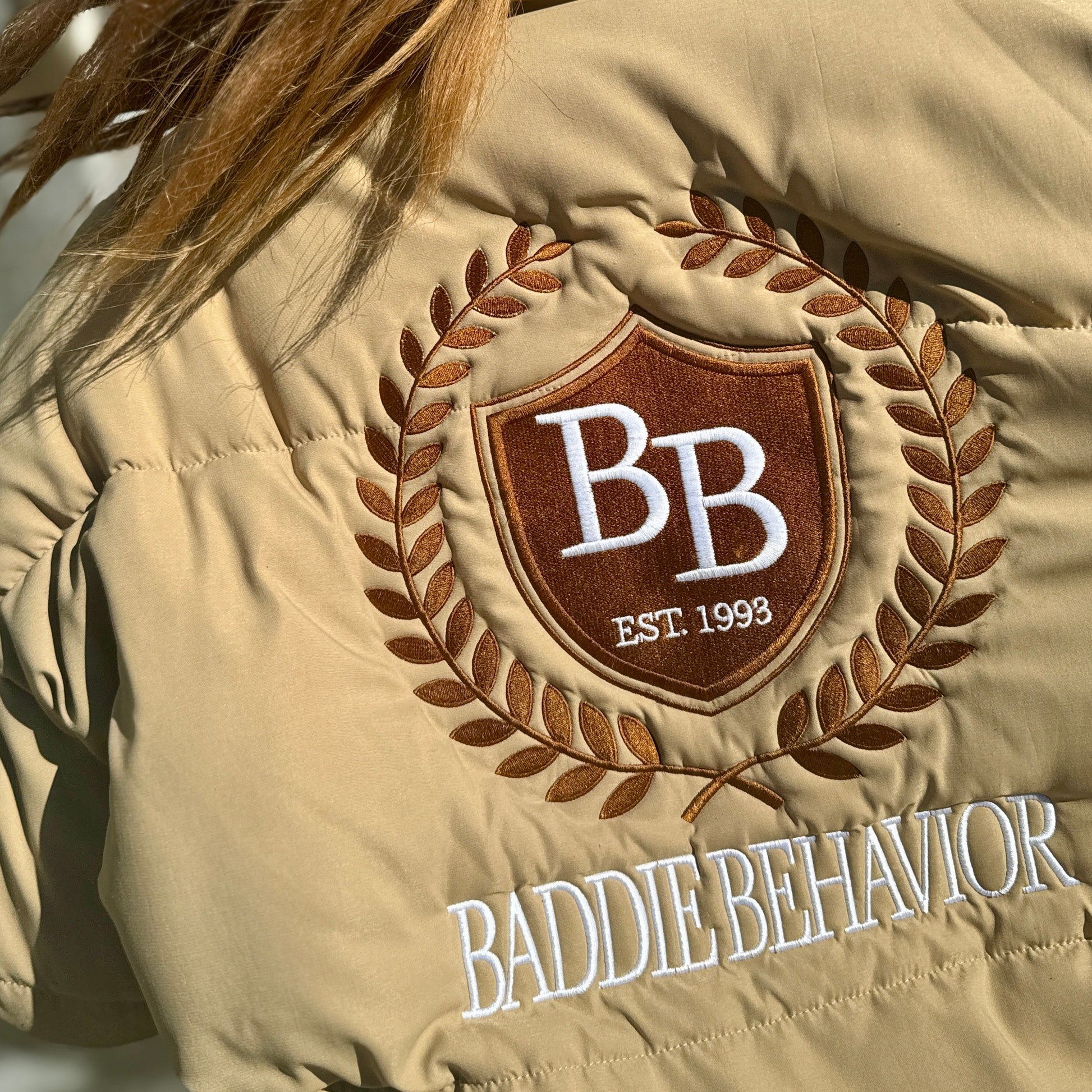 Made to turn heads, the Beige Baddie Heritage Stitched puffer has over 75,000 custom stitches, featuring the BB crest two toned logo on the front left chest and on the back.