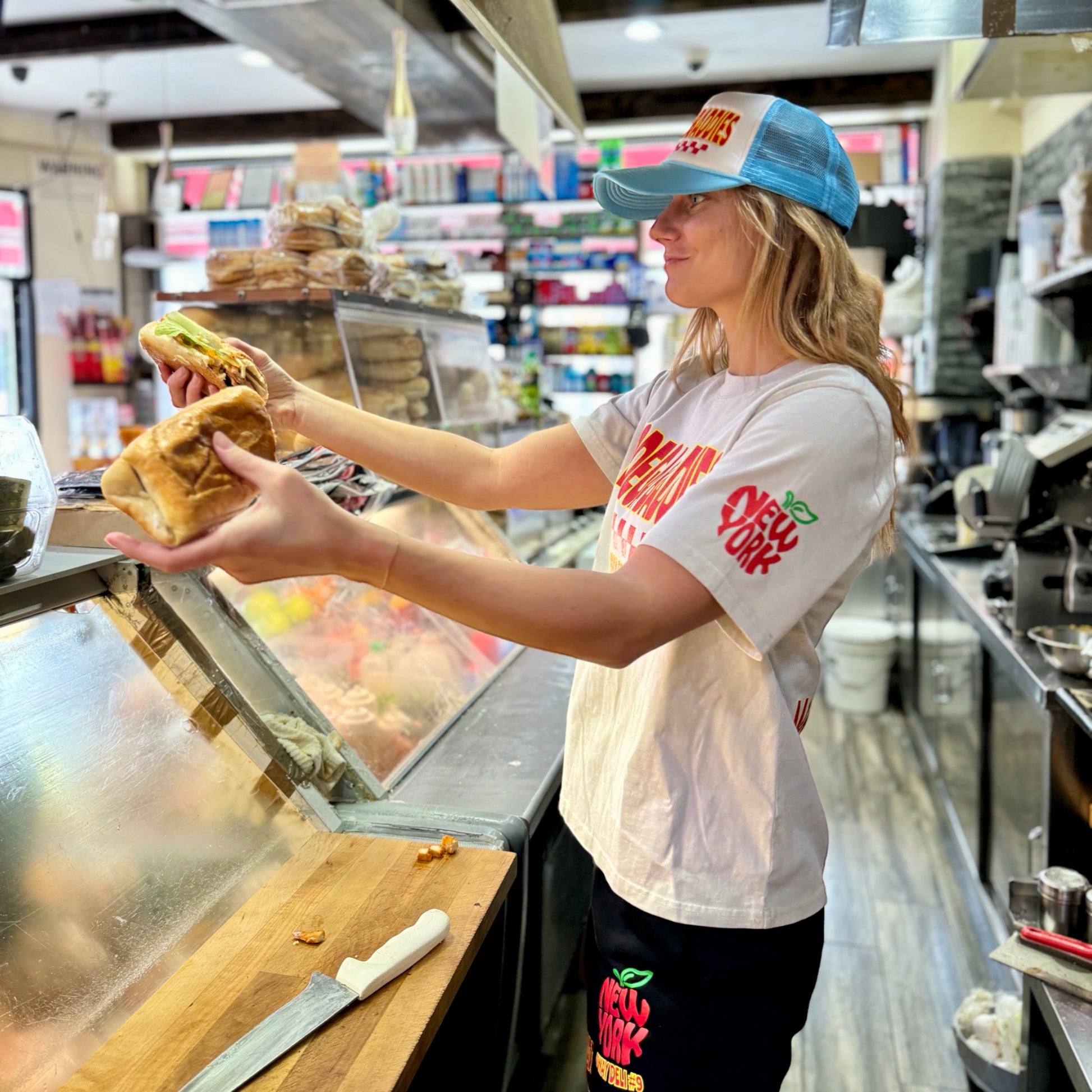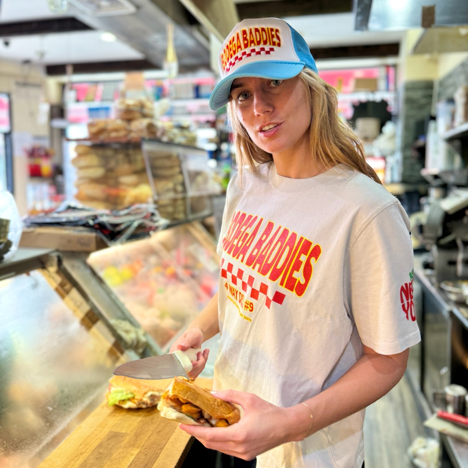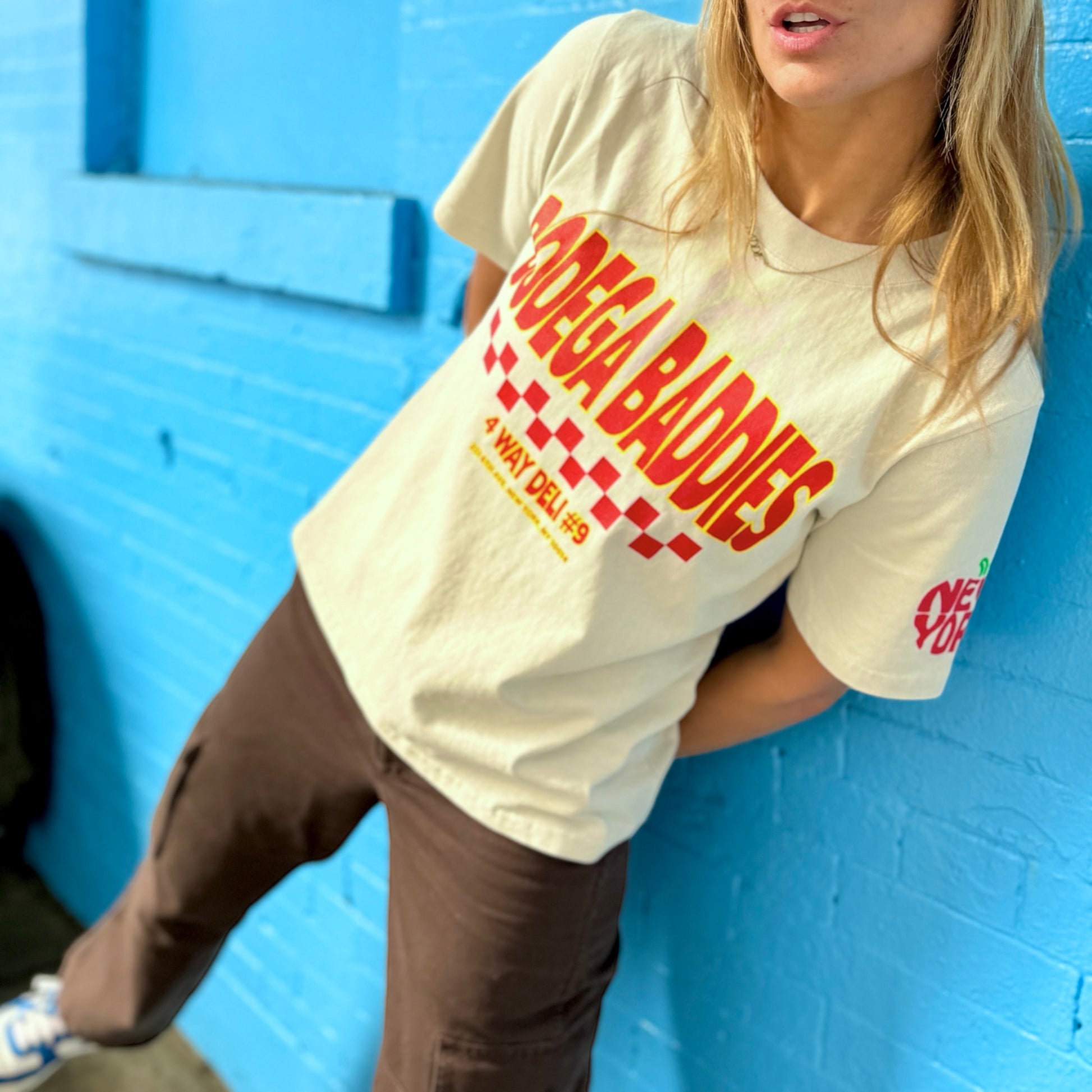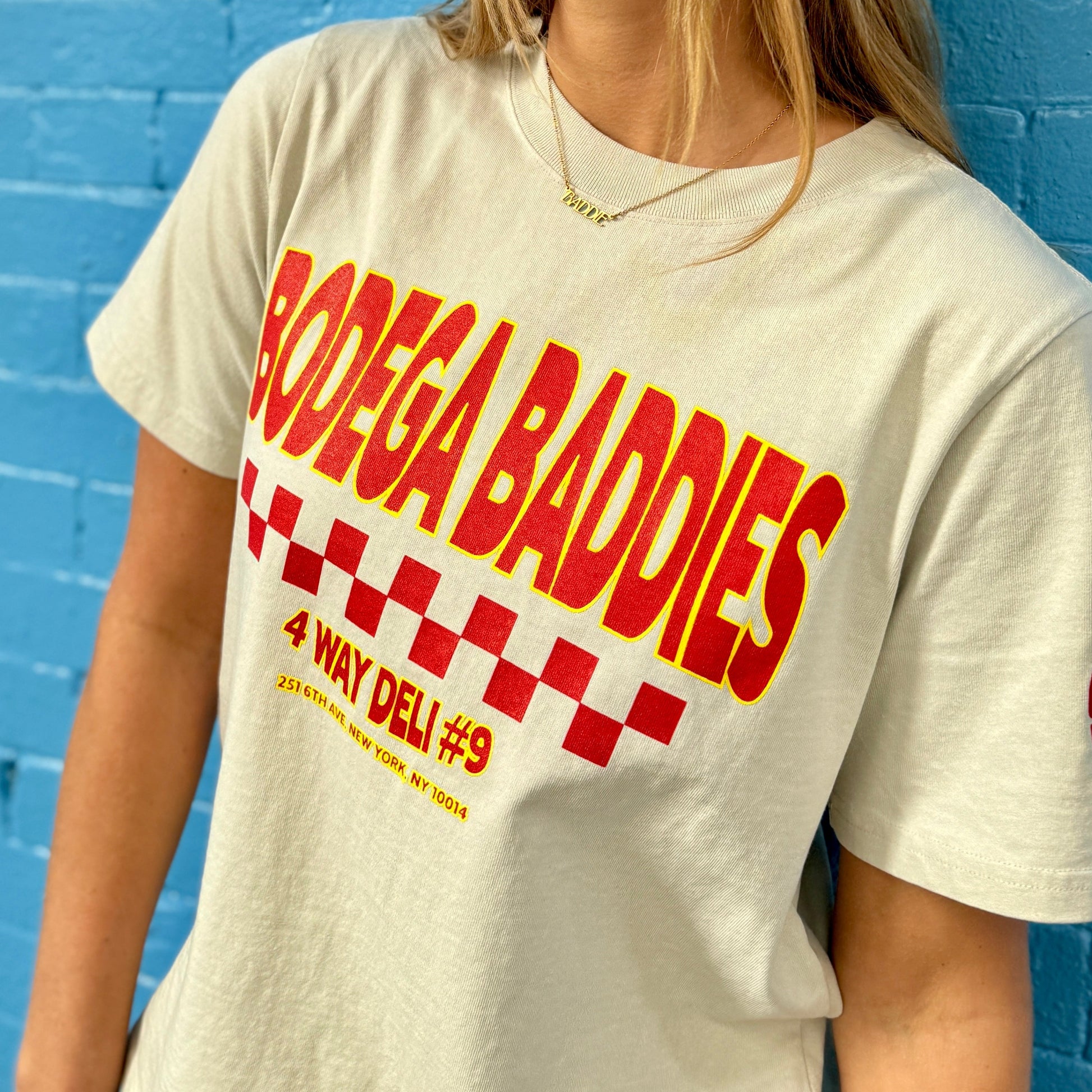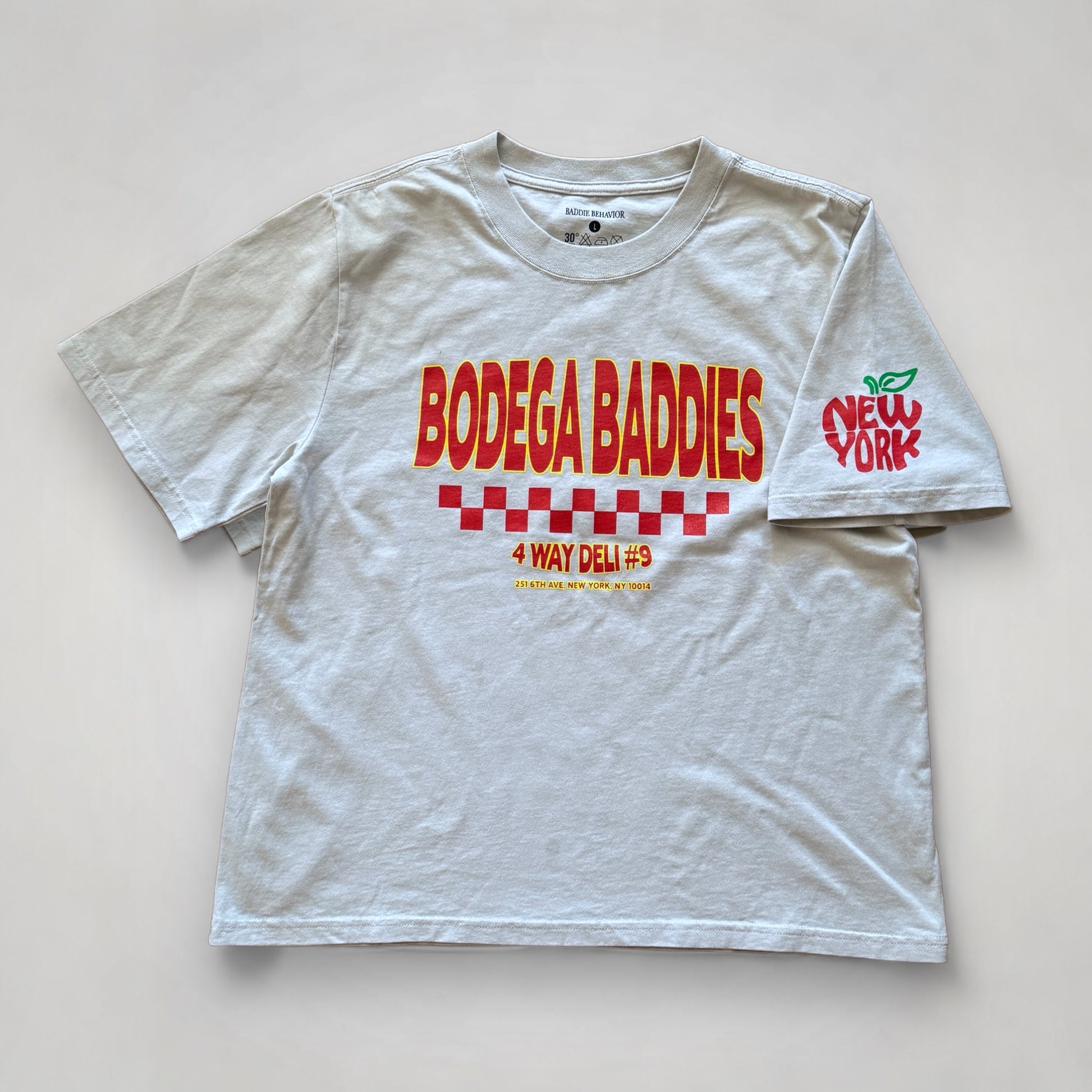 The perfect oversized fit, made for the baddies. Get the nostalgic 90s feel with this faded bone 100% cotton t shirt. Featuring the Bodega Baddies logo and address of 4Way Deli on the front, custom decals of New York's 'Big Apple' on the left sleeve, topped off with the ingredients of Marjana's sandwich at the bottom of the back