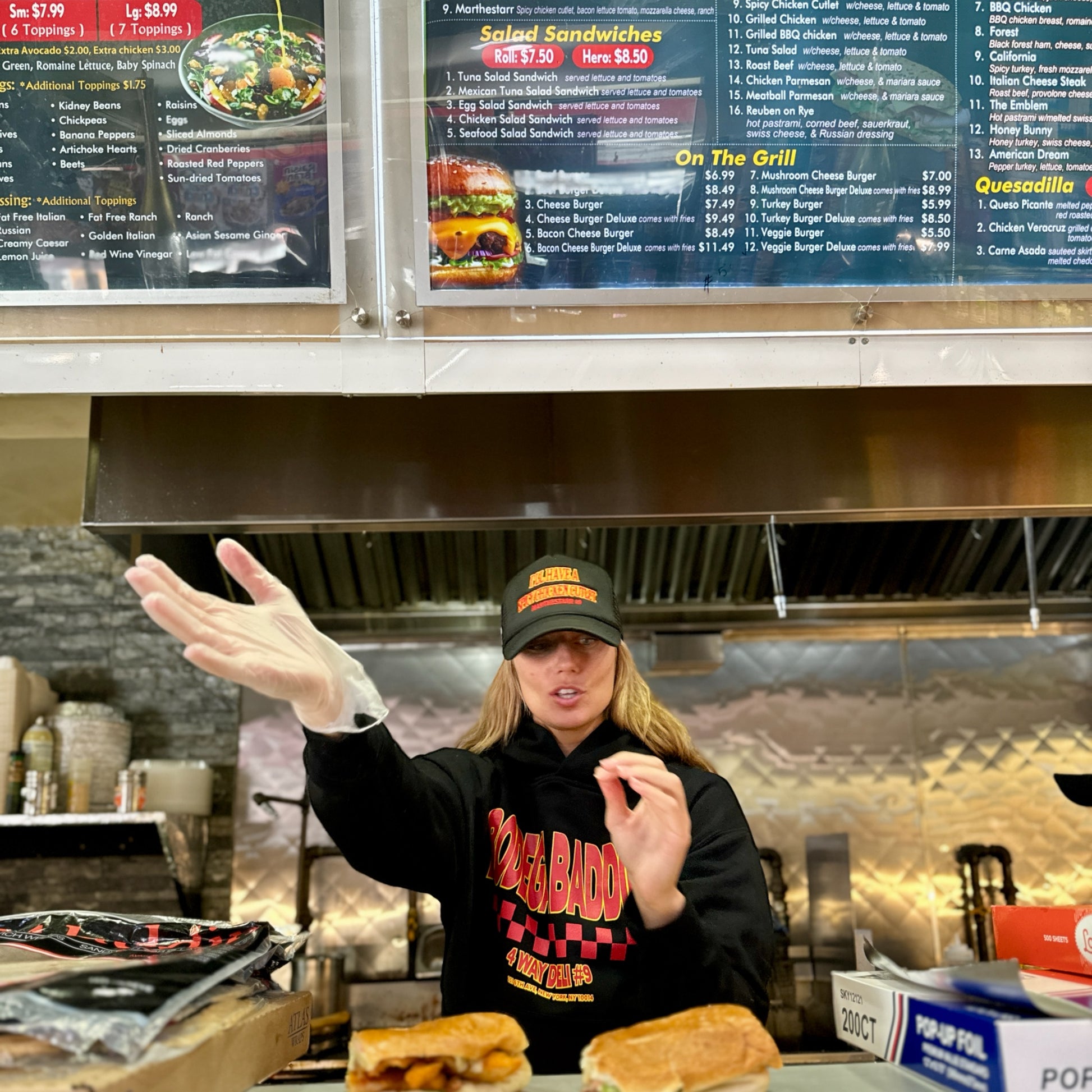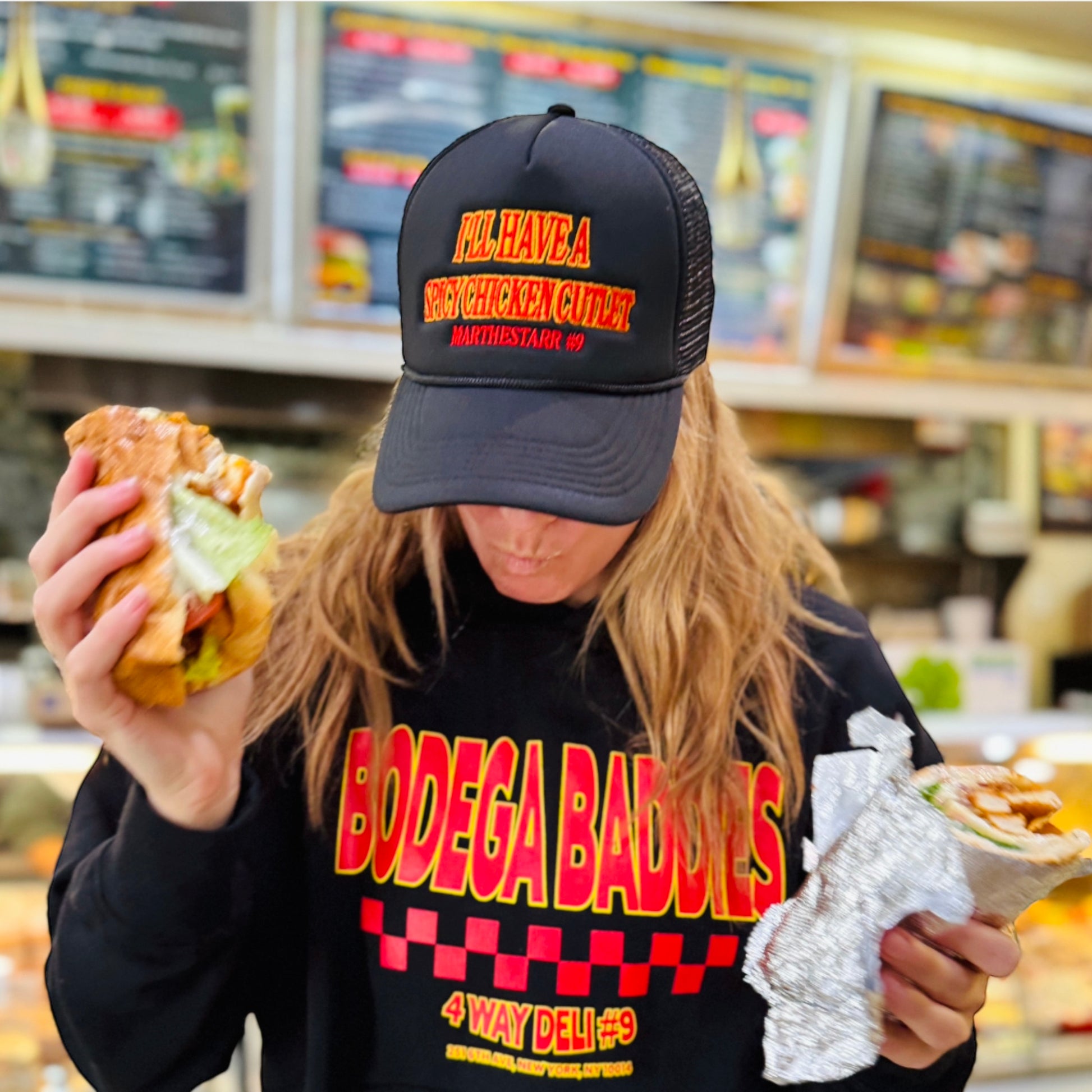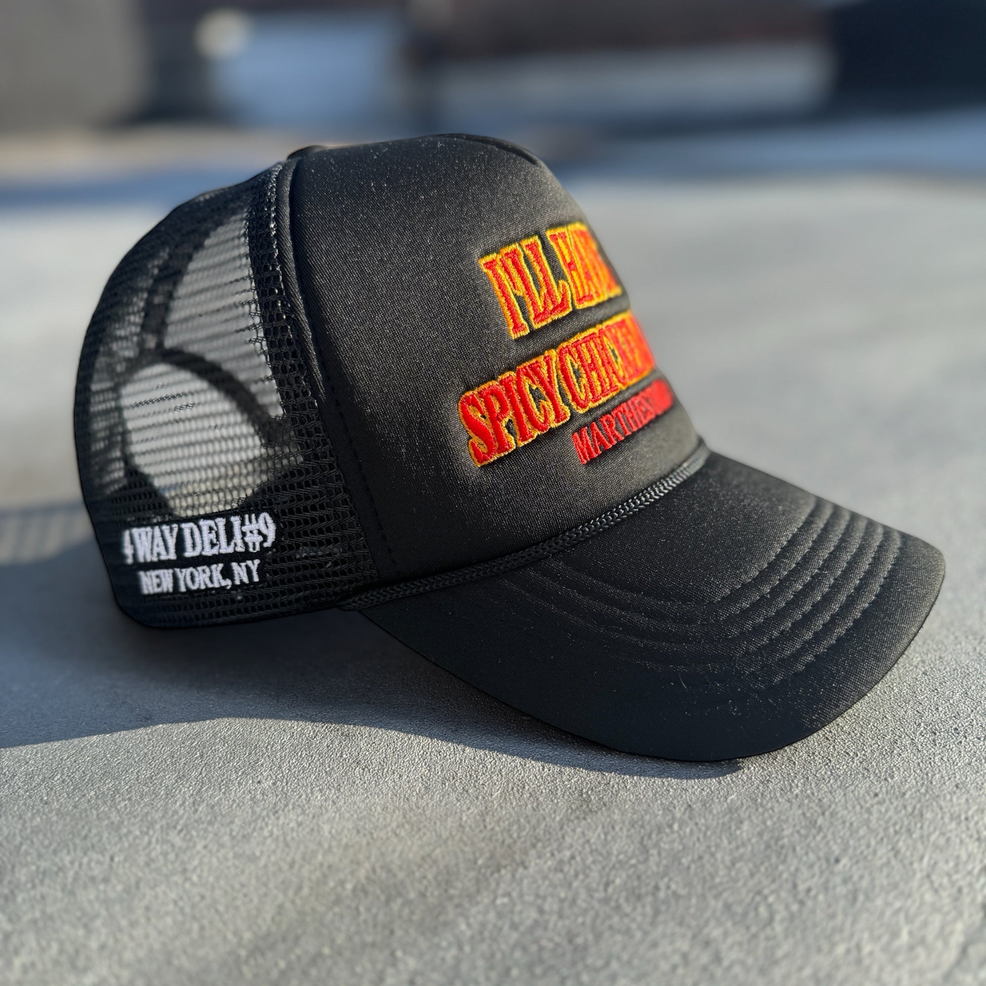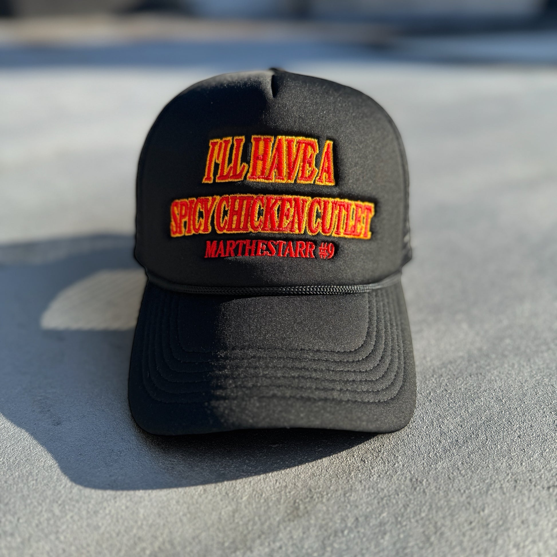 The official Marthestarr #9 and 4Way Deli Trucker Hat... 'ILL HAVE A SPICY CHICKEN CUTLET' will keep the people hungry for more.