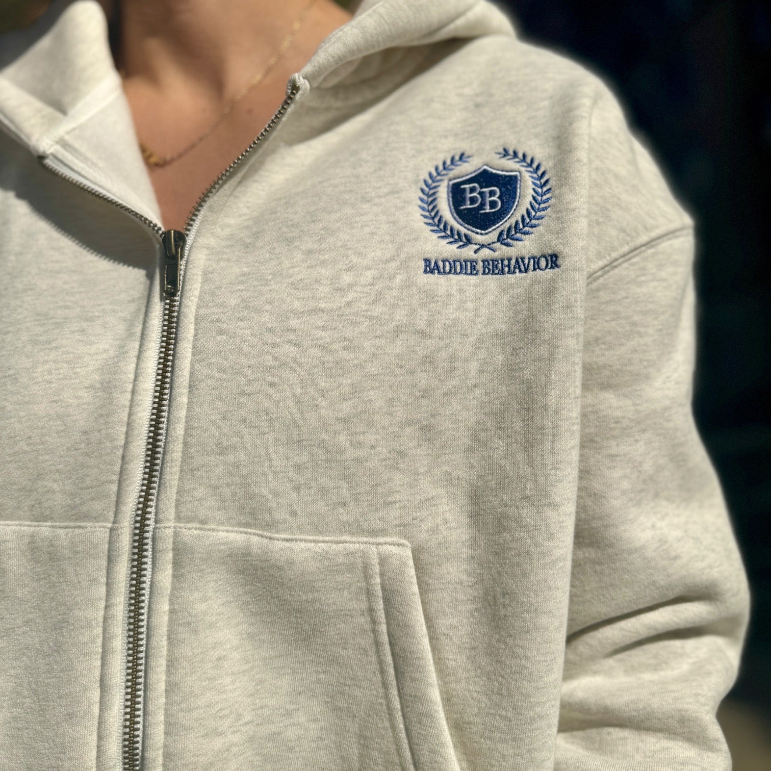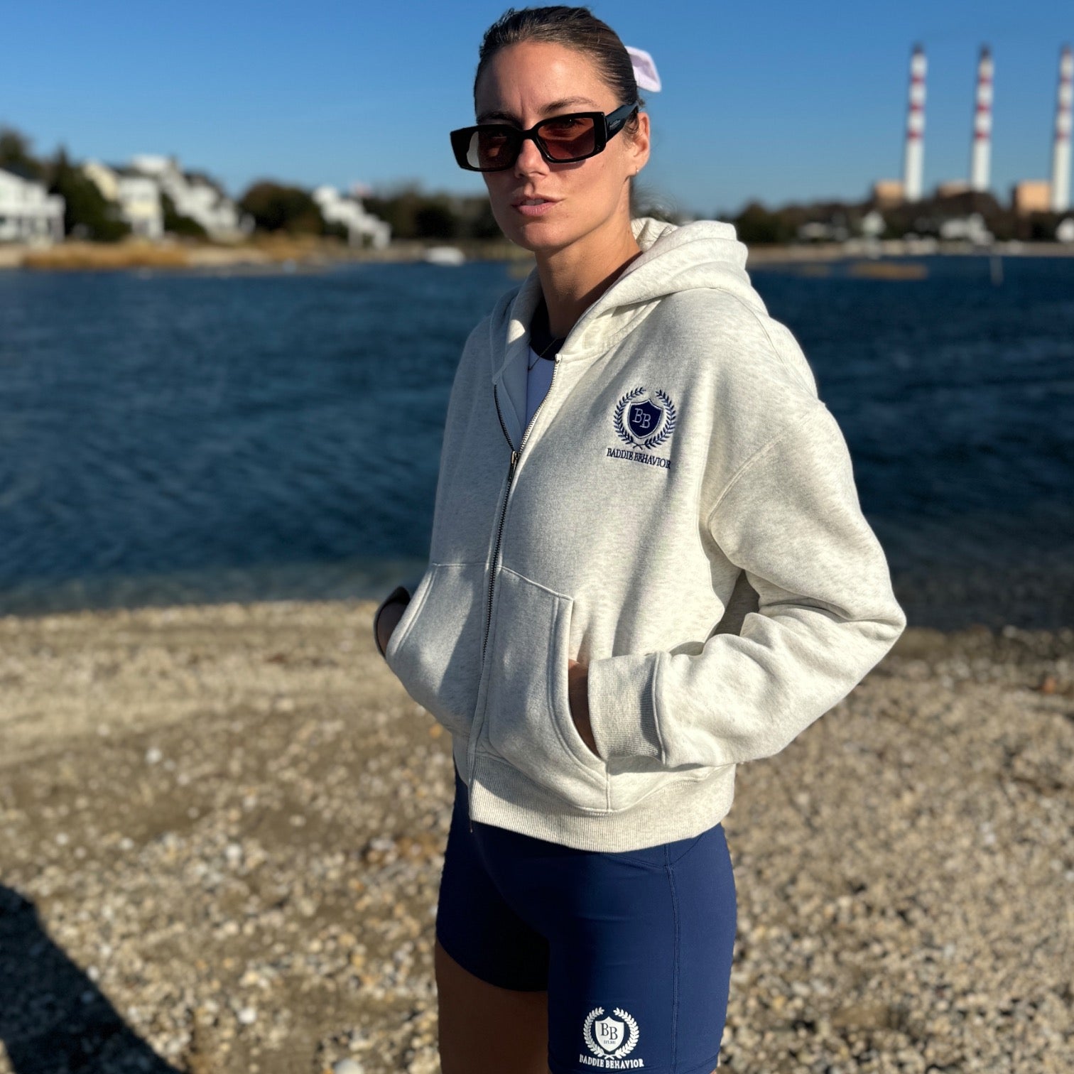 The Northport hoodie is a premium heavyweight cotton fleece in sand heather grey with double metal zippers for versatile wear. Hits at the hip bone for a flattering crop, featuring the embroidered Baddie crest on the left chest. Your go to staple!