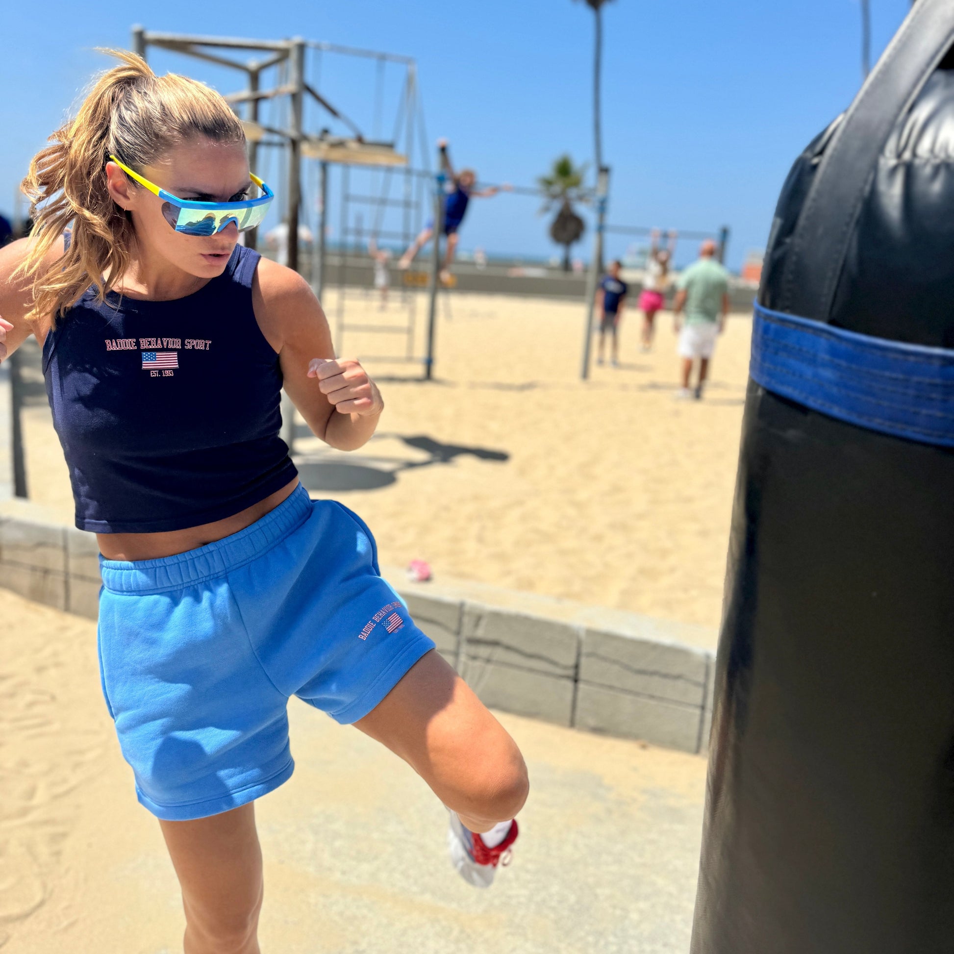 Made to move with you, our navy relay tank is made of 100% flat cotton, with a high neckline and double needle hem. Slightly cropped for a flattering fit. Featuring the classic Baddie Behavior Sport logo on the chest.