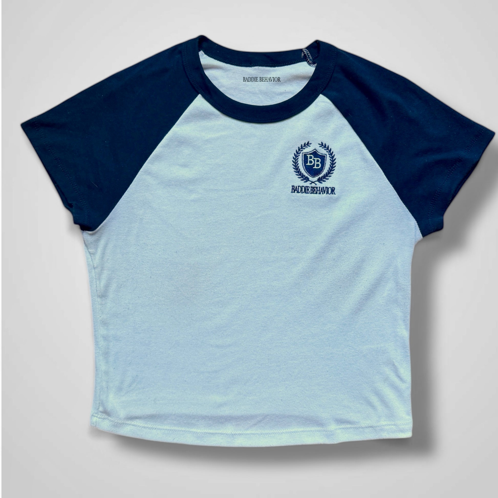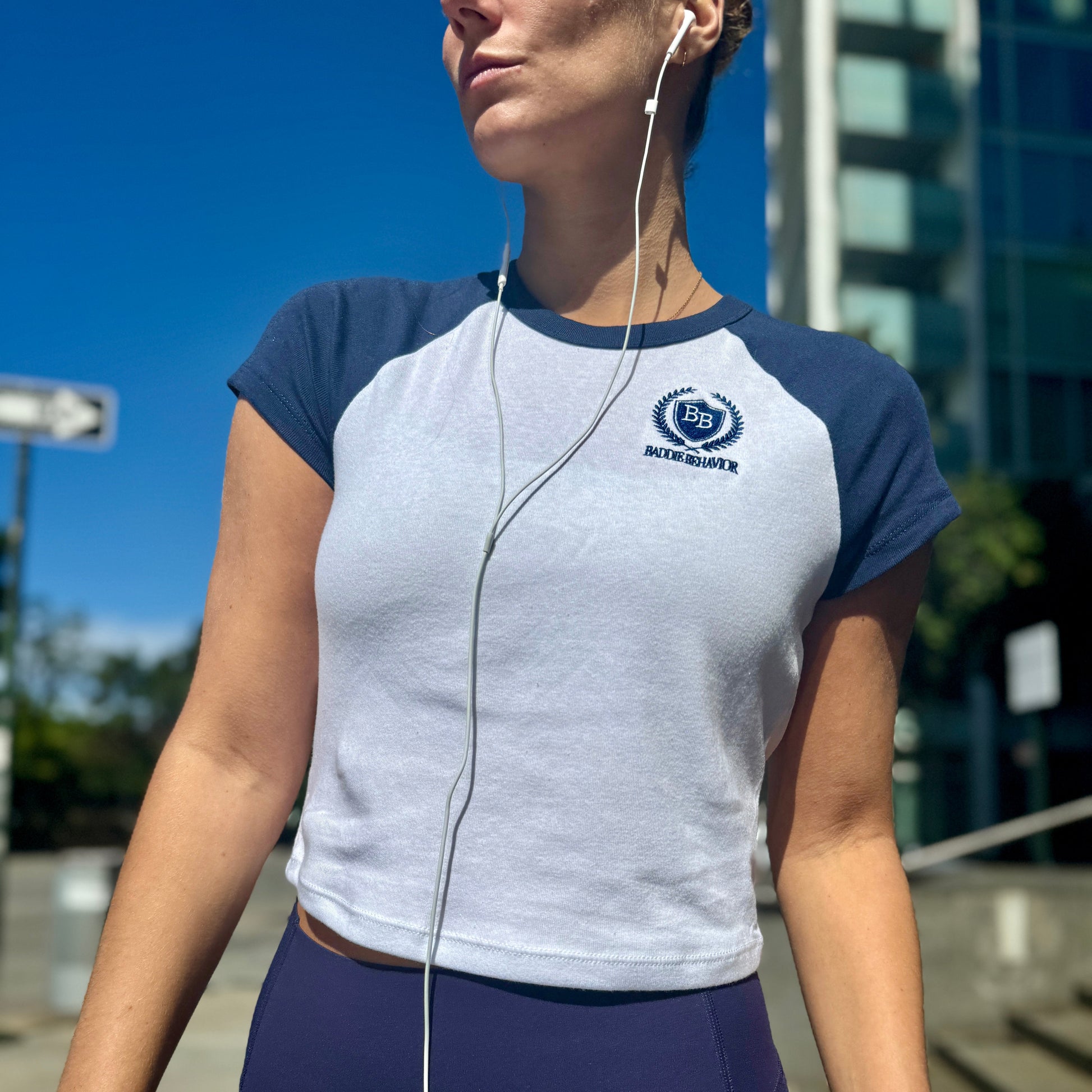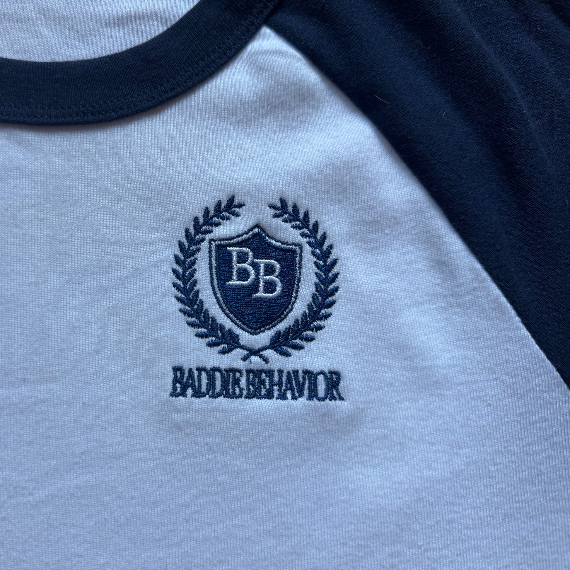 The timeless varsity look, reimagined for the baddies. This mid-length tee features the stitched Baddie Behavior logo on the upper left chest in navy, complemented by raglan sleeves for the varsity vibe.