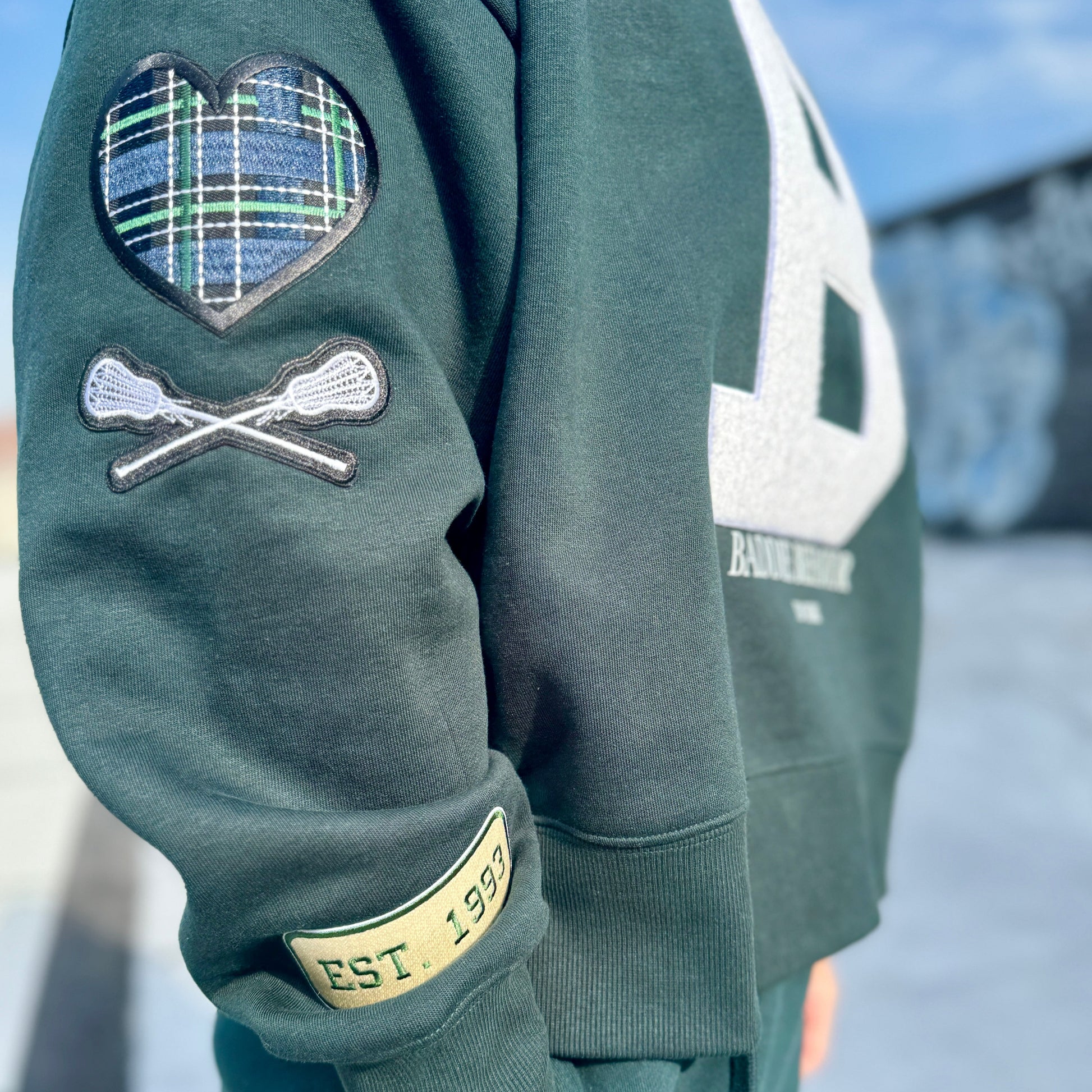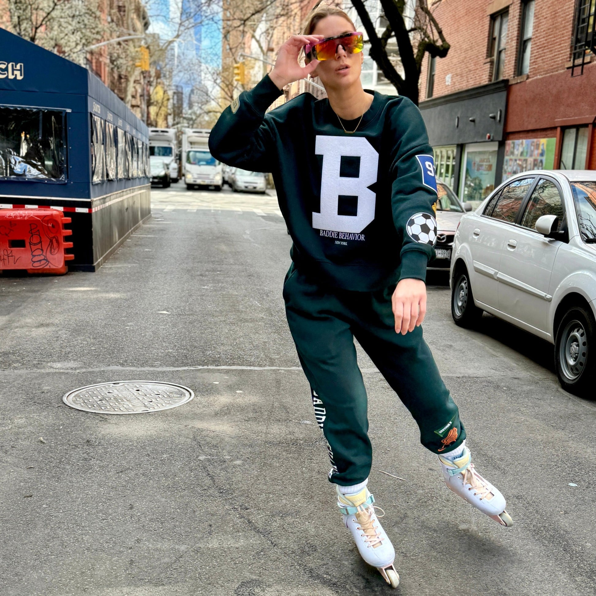 A true statement piece, The Varsity Crewneck is relaxed with an oversized fit and dropped shoulders. An authentic letterman chenille 'B' sits in the middle with a classic BADDIE BEHAVIOR NEW YORK under it. Both arms are dripping in patches that reflect Marjana's varsity achievements from high school in New York during the mid 2000s. It stops at the hip bone for an elegant cropped fit that she likes on her tops.